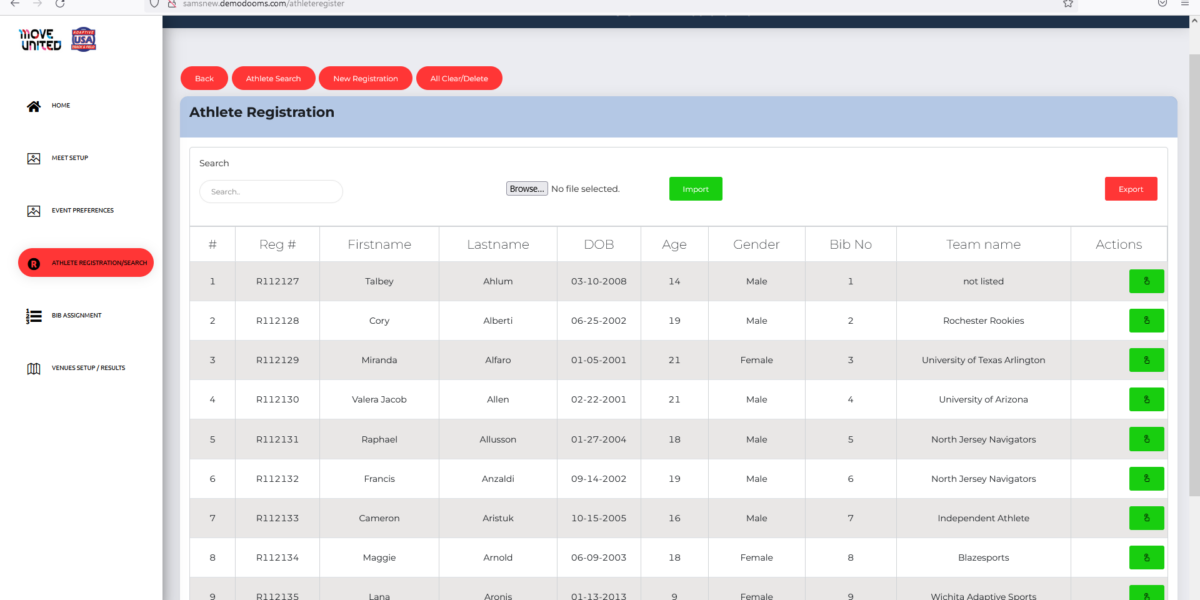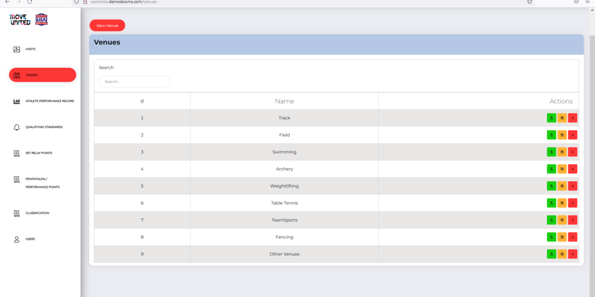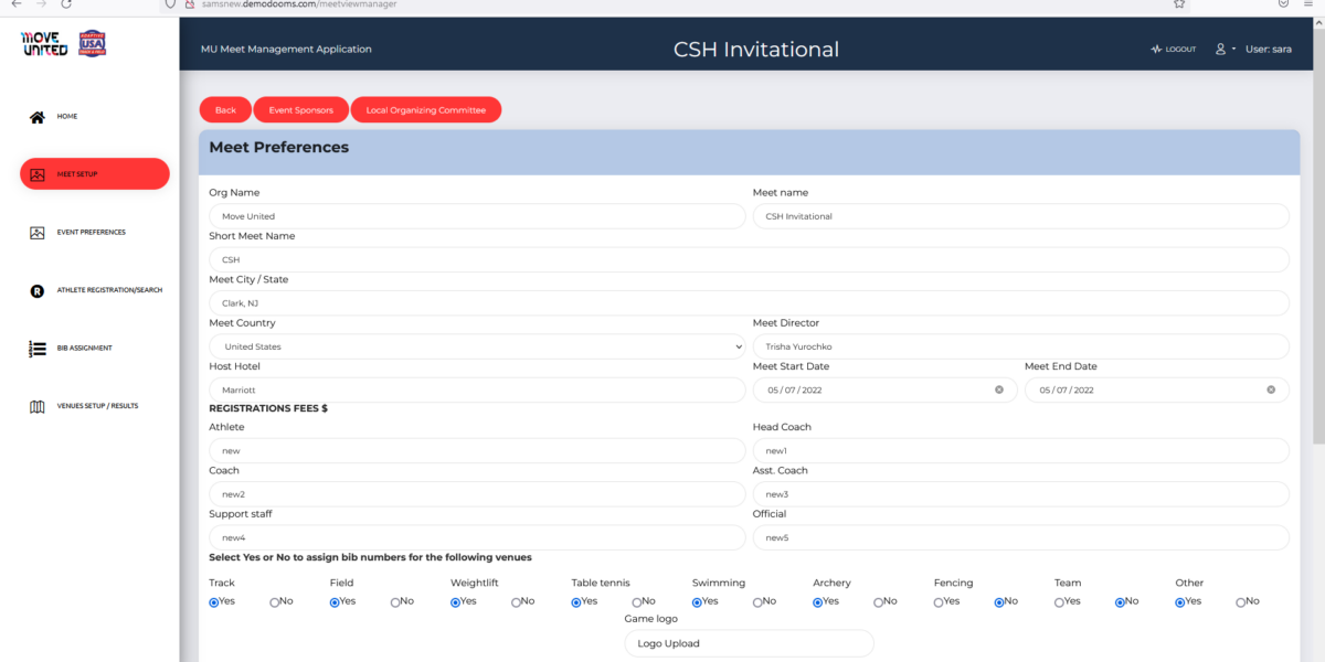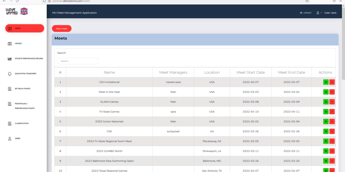 | Details | SAMS is a meet management application where admin creates Meet which then configured by Meet Manager. Meet Manager can create venues, tracks, register athletics, assign tracks to athletics and feed the results at end of each Paralympic meet. Meet manager can import or export data for bulk registration and configurations. The BIB numbers to athletics assigned automatically based on the rule configurations. And there tons of features for admin and meet manager to manage the meets thoroughly. |