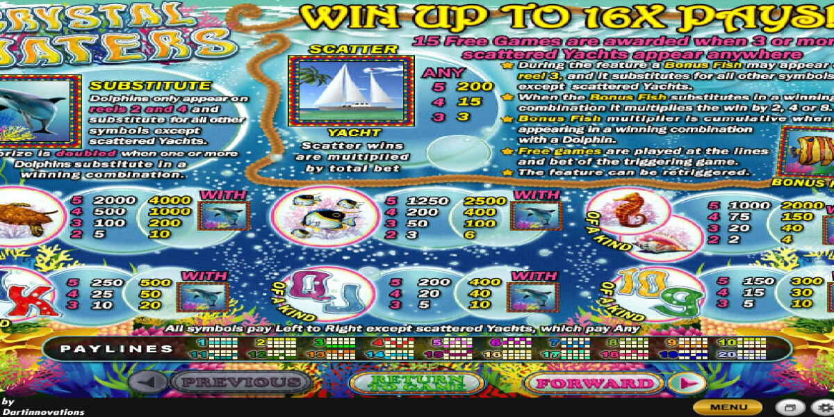 | Details | An online web casino slot game played through desktop browsers. Crystal Waters come up with underwater theme and 20 available pay lines to play. We can play as many as all of them or as few as one line. Each of the five reels will come to a stop, one by one and the credits will be paid out for any matching symbols according to the pay table. |